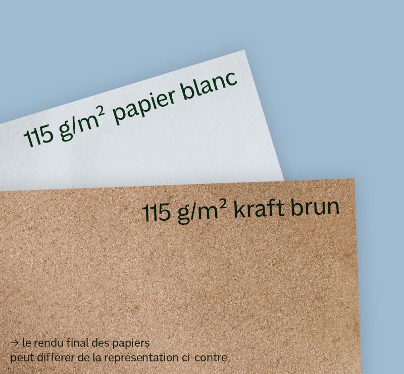 Le papier kraft brun apporte un aspect naturel et authentique, très prisé dans les univers éco-responsables. Le papier blanc, quant à lui, assure un contraste plus fort pour les visuels colorés ou foncés. Les deux versions sont en 115 g/m², garantissant une bonne tenue.